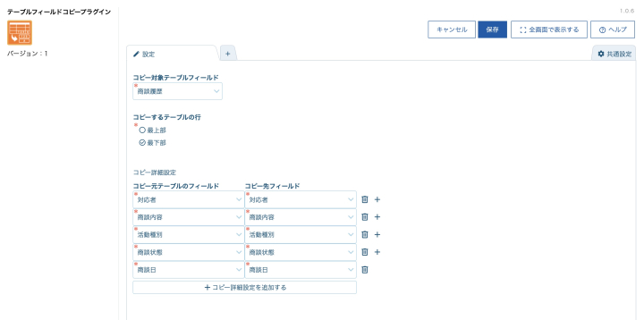 (コピー元・コピー先でフィールドの種類を揃えておきます。) - プラグイン設定画面で、コピー対象となるテーブル行を「最上部」または「最下部」から選択します。