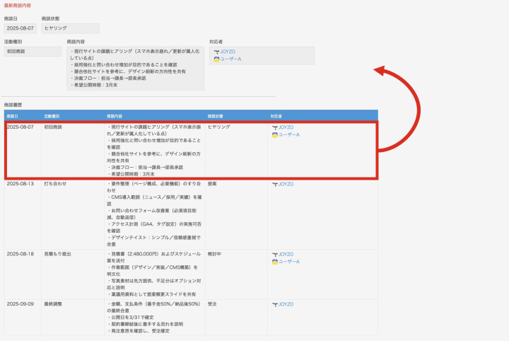 このような場合、 テーブルの最上部(=最も古い履歴)をテーブル外にコピーすることで、商談が進んだあとでも、「最初にどのような経緯で始まった案件なのか」をすぐに確認できるようになります。