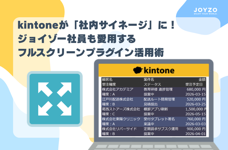 フルスクリーンプラグインは、kintoneに登録されているレコードを“フルスクリーン表示”にして、サイネージのように見せられるプラグインです。 例えば、案件の受注管理アプリだと、