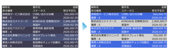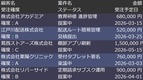 - 2段目(判断に必要な“進捗情報”):受注確度(左)|ステータス(中央)|受注予定日(右)