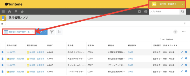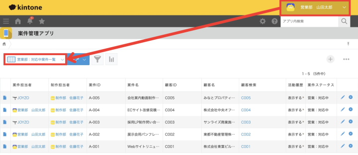 ※営業部に所属するユーザーの初期表示一覧を、営業部:対応中案件に設定した場合の初期表示