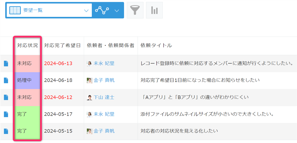 対応状況ごとに色分け表示することで、一覧で見た時に各レコードの対応状況が一目で把握しやくなります。