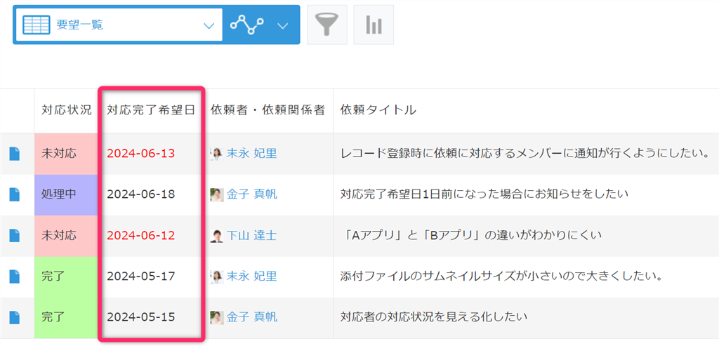 [要望受付]アプリで対応状況ごとに色分け表示を行い、対応期限が近付いた時に期限日が赤文字で表示されるようプラグインで制御します。