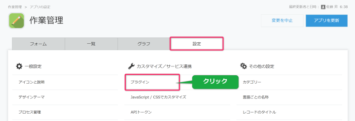 - アプリの設定画面の[設定]タブから「プラグイン」をクリックします。