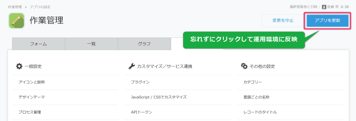 - プラグインの設定が完了したら、忘れずにアプリの設定を運用環境に適用します。