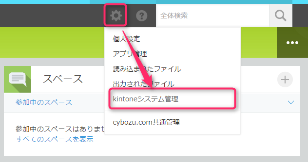- 画面右上の歯車をクリックし、[kintoneシステム管理]をクリックします。