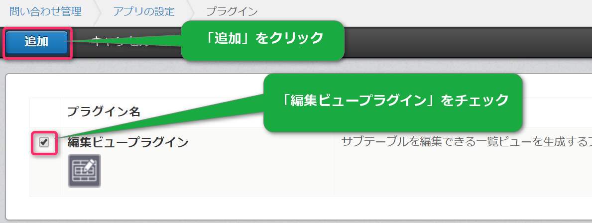 - 「プラグイン」一覧からテーブル編集ビュー設定プラグインを追加します。