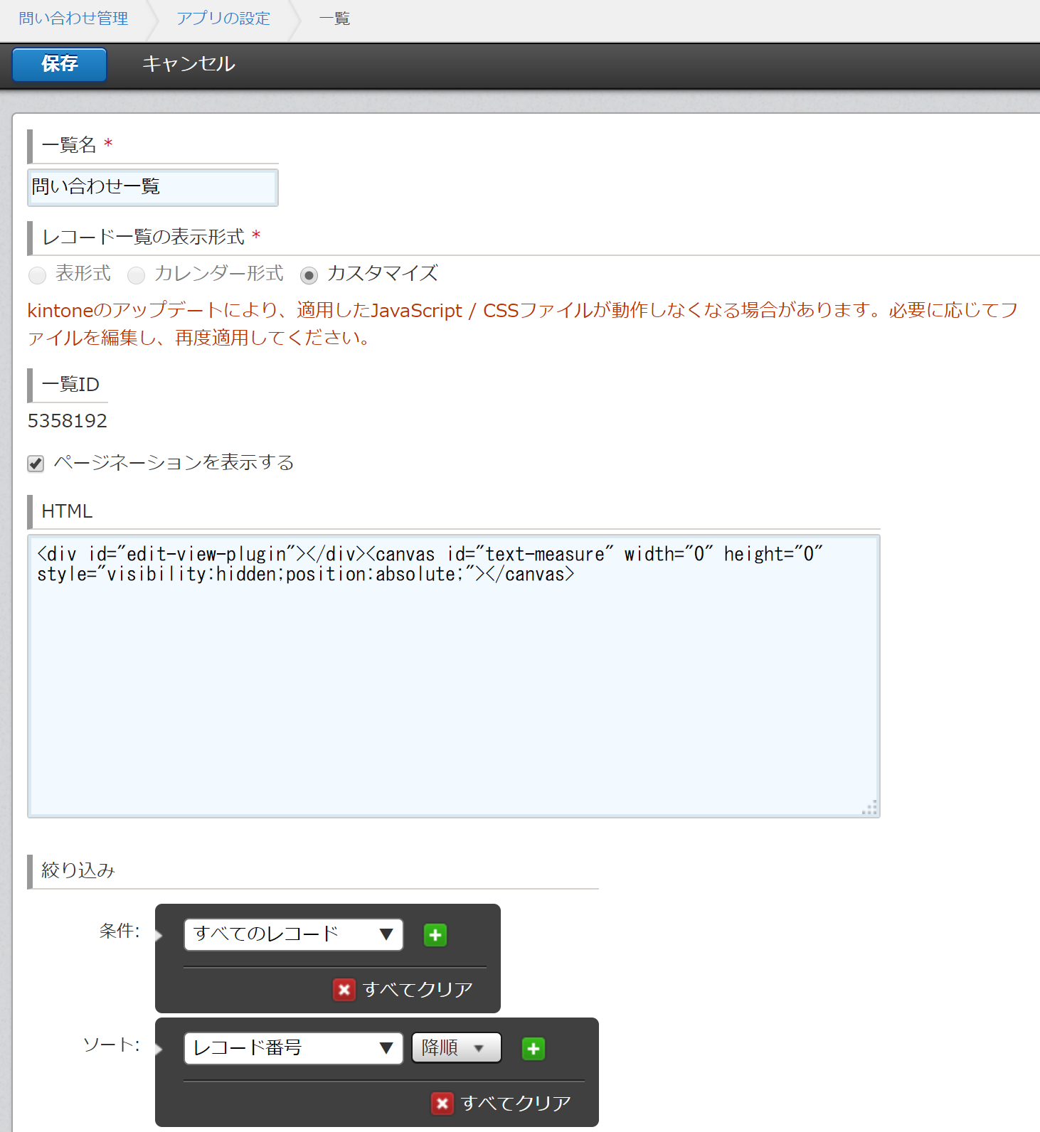 注)プラグインの設定者には、kintoneシステム管理者権限が必要となります。権限がないと保存ができませんのでご注意ください。 - ライセンスキーを入力し、一覧画面でのテーブル編集を適用する一覧を作成します。