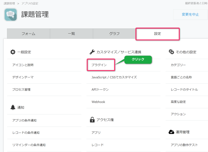 - アプリの設定画面の[設定]タブから「プラグイン」をクリックします。