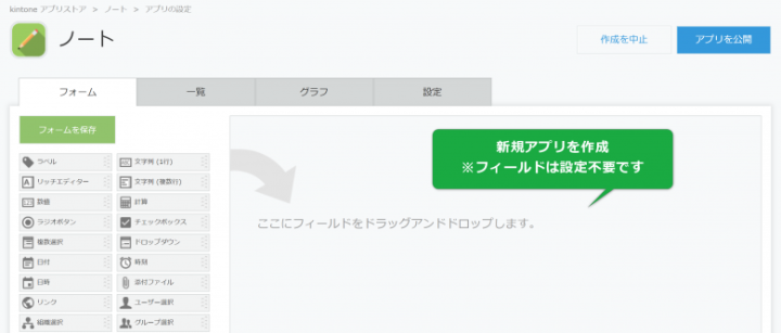 - 新規アプリを作成します。フィールドは何も設定しないでください。