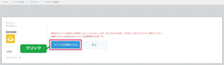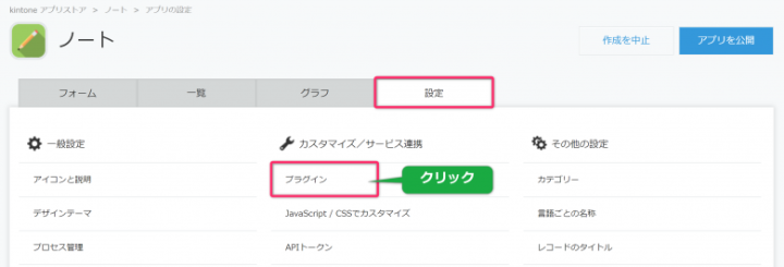注)既存アプリには本プラグインは利用できません。必ず「はじめから作成」で作成した空のアプリをご使用ください。 - アプリの設定画面の[設定]タブから「プラグイン」をクリックします。