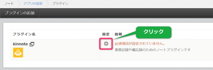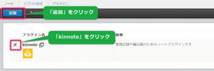 - 「プラグイン」一覧からkinnoteプラグインを追加します。