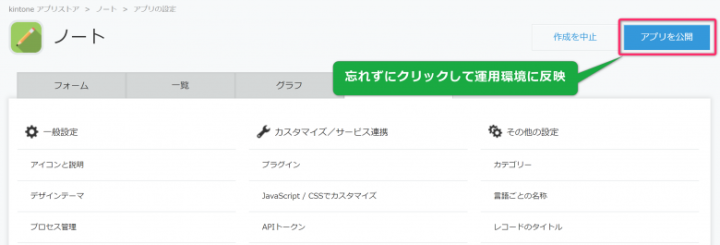 - プラグインの設定が完了したら、忘れずにアプリの設定を運用環境に適用します。