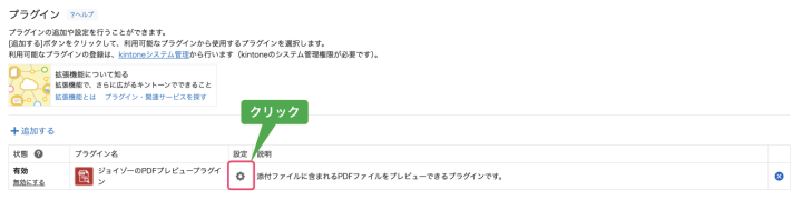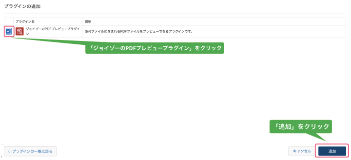 - 「プラグイン」一覧からジョイゾーのPDFプレビュープラグインを追加します。