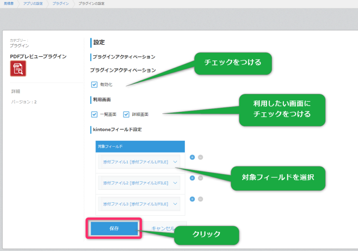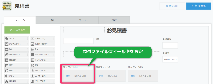 - 「PDFプレビュープラグイン」に対応する添付ファイルフィールドをkintoneアプリに準備してください。