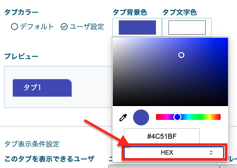 プラグインの設定画面にある色指定(カラーピッカー)ですが、初期表示では「RGB(赤・緑・青の数値指定)」になっています。