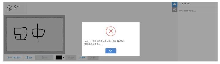 レコードのアクセス権で、手書き画像保存後更新フィールドが「01で設定した値」に等しい時に編集できない権限設定を行います - 02で設定した権限設定に等しい時に手書き保存を行おうとするとエラーが表示される