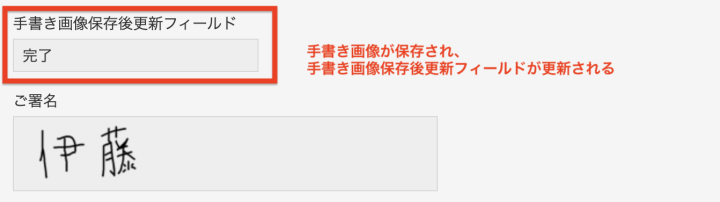 手書き2プラグインには、書き込みを保存したタイミングで、kintone内の別のフィールドの値を自動的に書き換える機能(手書き画像保存後更新フィールド)が備わっています。