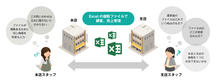 ・複数のExcelファイルで顧客や売上情報を管理。パスワード入力もしていたため管理が煩雑に。