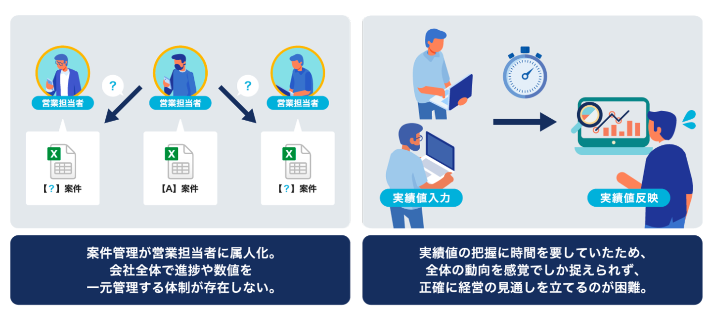 - 案件管理が営業担当者に属人化しており、会社全体で進捗や数値を一元管理する体制が存在しなかった