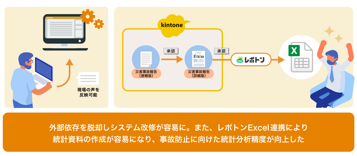 また、以前のシステムでは帳票がPDF形式でしか出力できず、データの加工や再利用が非常に困難な状況でした。現在は、kintoneと帳票出力システムの連携により、Excel形式で自在にデータを出力できるため、事故発生状況の経年比較や詳細な傾向分析といった統計加工がスムーズに行えるようになり、事故防止に向けた分析の精度と業務効率が向上しています。