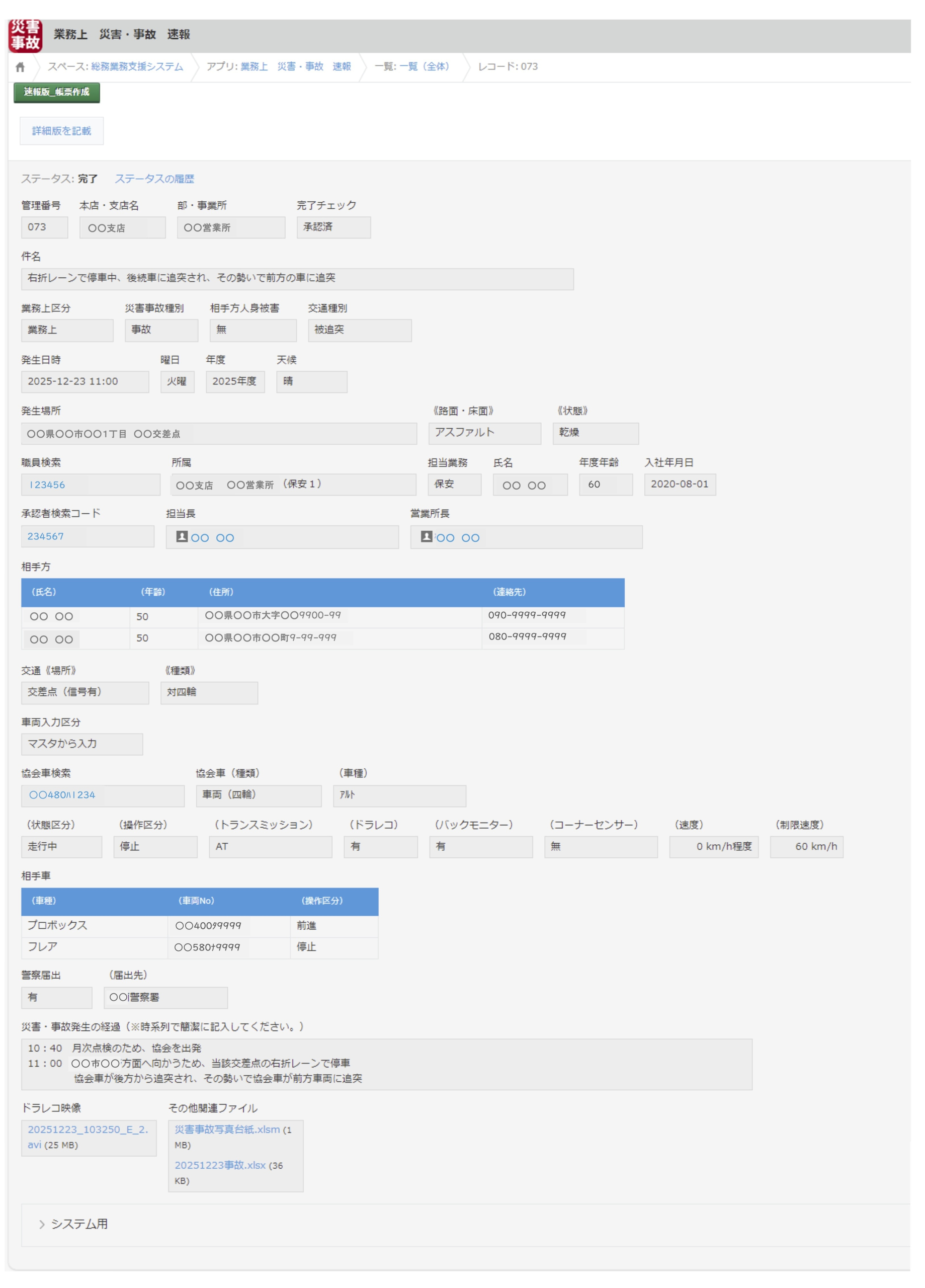 業務上災害事故管理では、社内周知の質が向上しました。旧システムは自動で通知がされて便利ではありましたが、内容の精査ができず誤字等もそのまま流れてしまう課題がありました。kintone導入後は、担当者が内容を精査してから周知する仕組みに変わり、動画や写真を埋め込むなどの工夫ができるようになったことで「以前より分かりやすくなった」と好評です。