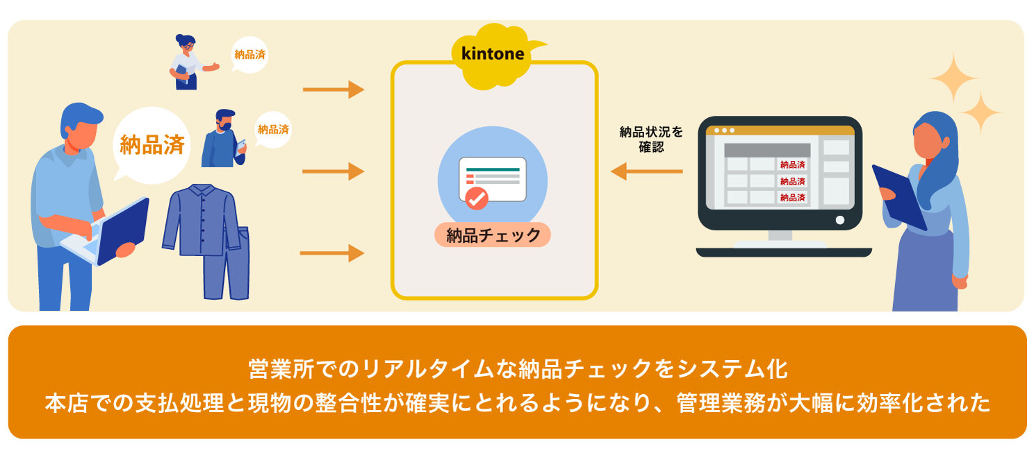 さらに、今回の開発を通じてkintoneの柔軟性を実感し、当初は別の方法を検討していた被服貸与管理もkintoneに統合することに決めました。結果として、営業所でのリアルタイムな納品チェックが実現し、本店での支払い処理との整合性が確実にとれるようになっています。