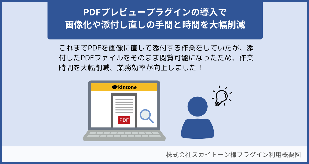 株式会社スカイトーン様は「基本機能を中心とした市民開発」を推奨されており、PDFプレビュープラグインがその考えに適したシンプルな機能であるとし、様々なアプリに活用可能な、安心して他社にもお勧めできるプラグインとして位置づけられています。