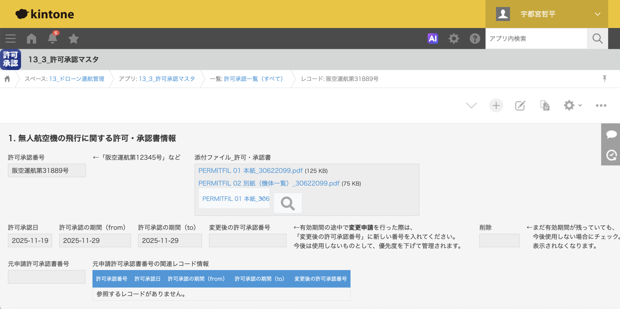 株式会社スカイトーン様では、ドローンの飛行許可・承認書や機体管理、案件管理や活動記録など、様々な業務でkintoneを活用し、添付ファイルフィールドにPDFファイルを添付して管理していました。