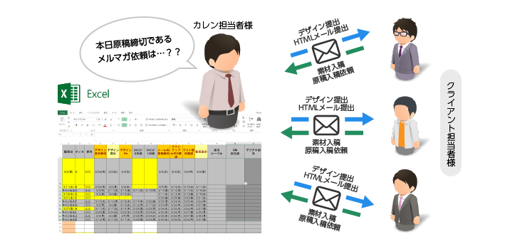 クライアント先である某大手レコード会社様のメルマガ配信支援業務を行う部門ではクライアントから原稿、画像素材等の提供をメールでやり取りし、メルマガ入稿のステータス管理をExcelで行っていました。