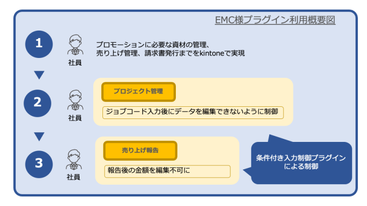 医師向けにしか販売しない特別な薬剤のプロモーション事業を行っており、プロモーションに必要な資材のコスト管理から売上管理、請求書の発行までの業務を全てkintoneで行っている。入力チェックを別サービスで考えていたものの思ったように制御させることができなかったため、条件付き入力制御プラグインを導入することになった。