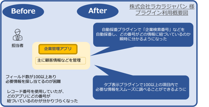 顧客管理をしている企業管理アプリでは、フィールド数が108あり、必要な情報を調べるのために項目が多くスクロールして時間がかかっていたため、タブ表示プラグインを導入した。