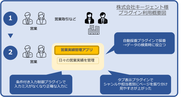 営業実績や顧客管理アプリなどをkintoneアプリで日々利用しており、kintoneに入力する情報が多く縦のスクロールが長くなってしまい、より効率的入力作業に無駄のない作業にできないか改善に悩み、標準機能ではできない機能であるタブ表示プラグイン・条件付き入力制御プラグインの導入を検討した。