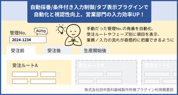 生産管理アプリで管理する中で、受注ルートが多数あるためルート別に条件を設定し、複雑なデータ入力項目が多い中でも、使いやすさを維持しながら、誤入力を防ぐために導入した