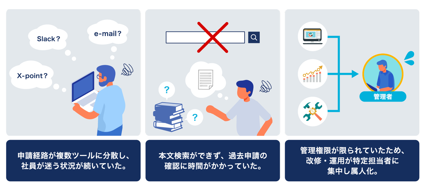 以前は、 「経費はX-point、備品はフォーム、アカウント申請はメール」というように申請方法がバラバラで、社員からの問い合わせも多く、処理漏れや確認作業に追われていました。また、それぞれのサービスへのアカウントの発行や管理が必要になるなど、管理側の負荷も大きくなっていました。