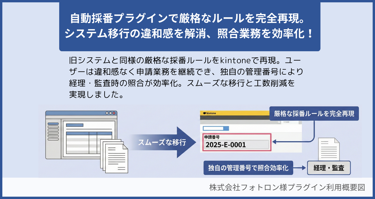 自動採番プラグインの導入により、従来と同様の採番ルールをkintone上で再現することに成功しました。これにより、ユーザーはシステムが変わっても違和感なく申請業務を行うことができ、スムーズな移行が実現しました。