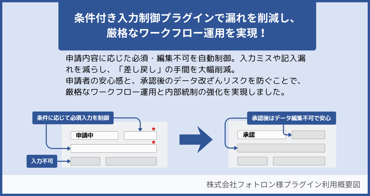 特に、特定の条件(金額や申請種別など)に応じて入力項目を必須にしたり、承認プロセスが進んだ段階で内容を書き換えられないようにロックしたりといった、データの整合性を保つための統制機能を実装するために導入されました。