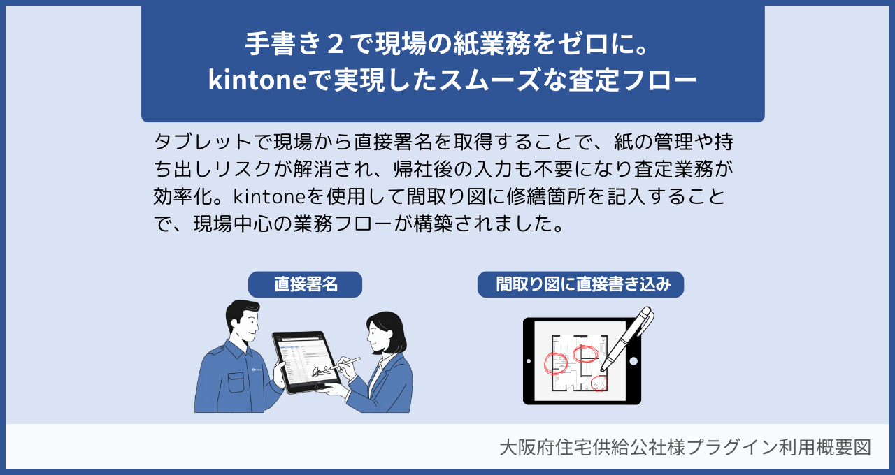 そこで、既存のkintone上の入居者情報を活用し、タブレットを用いた現地完結型の査定アプリを作成するため、画面上でスムーズに署名を取得できる本プラグインの導入を決定しました。