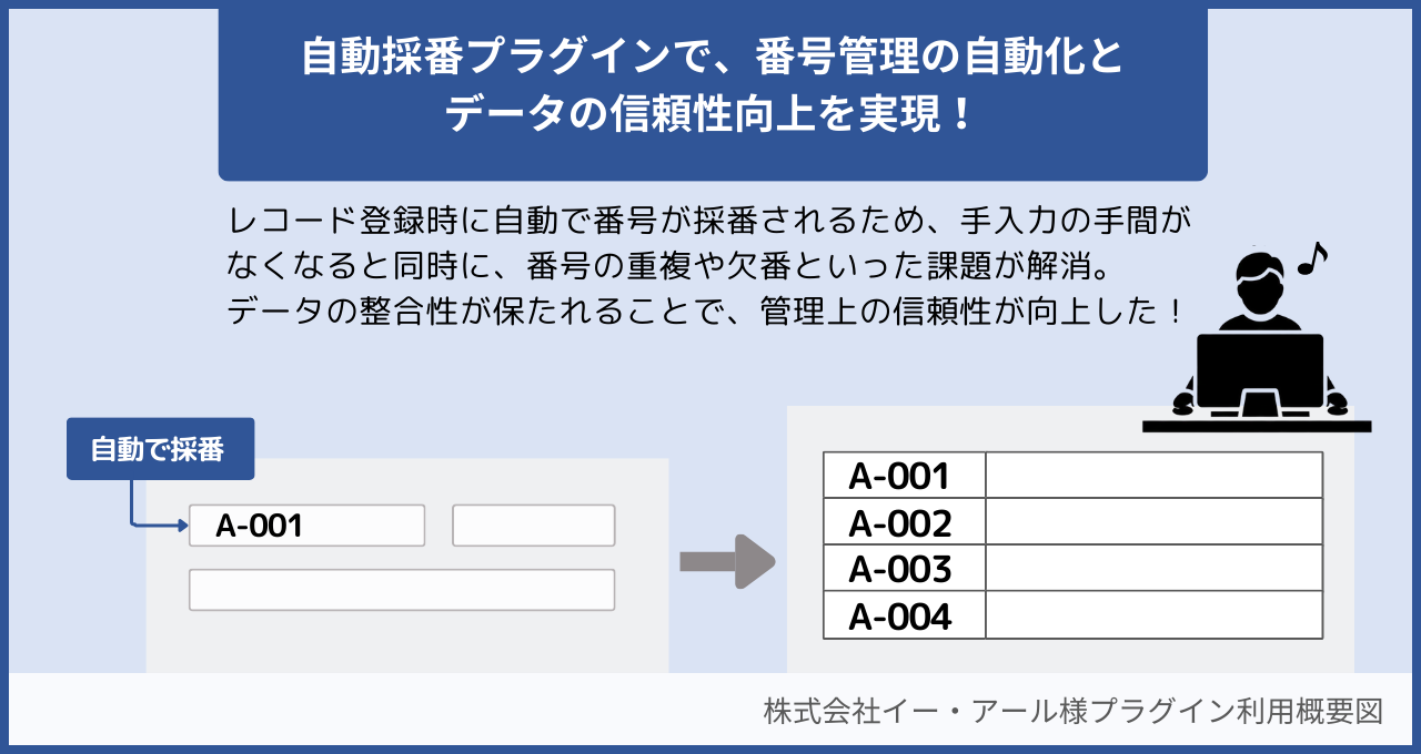 レコード登録時に自動で番号が採番されるため、手入力の手間がなくなると同時に、番号の重複や欠番といった課題が解消されました。データの整合性が保たれることで、管理上の信頼性が向上しています。