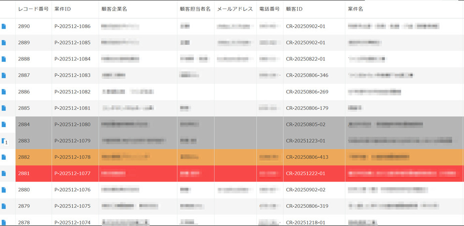 条件に応じて一覧画面の行に色をつけることで、対応状況が視覚的にわかるようになりました。完了した案件や事前連絡が必要な案件などが色分けされるため、状況判断がスムーズに行えます。社内では見やすくなったと評価されています。