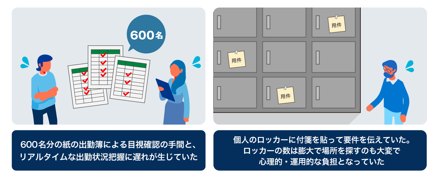 また、従業員への業務連絡や呼び出しを行う際も、個人のロッカーに付箋や貼紙を貼って伝えていました。しかし、ロッカーも600名分あり場所を探すのも大変なうえ、管理部門の担当者が異性のロッカー室に入らなければならないケースもあり、心理的・運用的な負担となっていました。