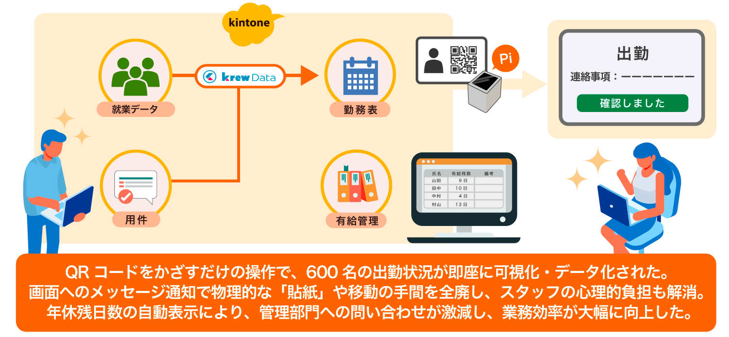 一番の改善は、出勤管理と連絡業務の効率化です。以前はA3用紙でのアナログ管理でしたが、現在はタブレットにQRコードをかざすだけで出勤記録が完了します。管理側も、誰が出勤しているかをkintone上のデータや専用画面で即座に確認できるようになりました。