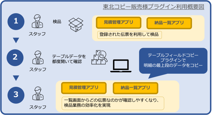 プラグインの導入により明細の最上段のデータがフィールドにコピーされるため、一覧からどの伝票なのかが確認しやすくなり、検品業務の効率化を実現することができた。