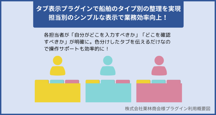 タブ表示プラグインの導入により、情報の一覧性と操作性が大幅に向上しました。手続きごとにタブ分けを行うことにより、担当者は必要なチェックリストに迅速かつ簡単にアクセス可能となり、船のタイプに応じた手続きがわかりやすく整理されました。