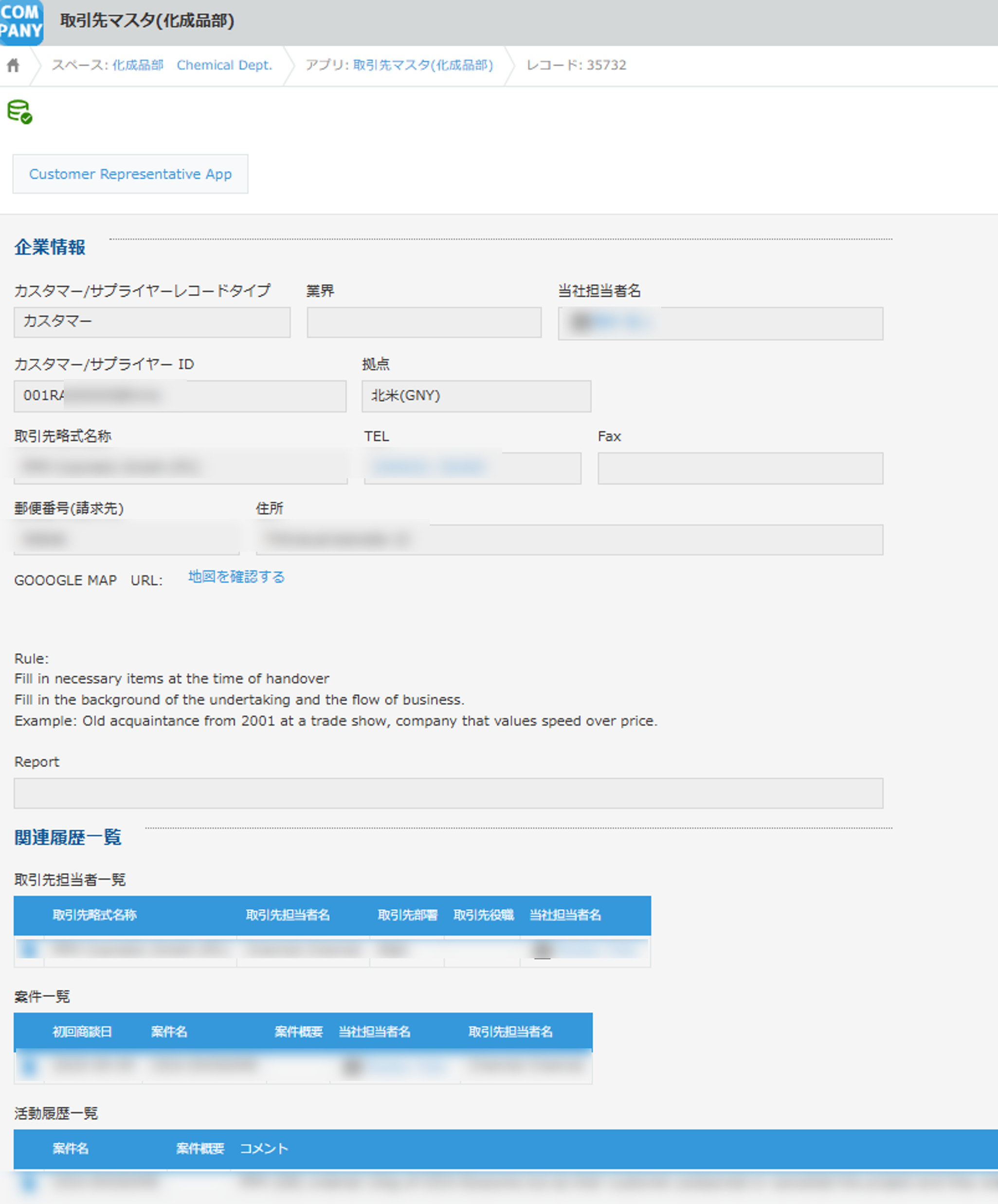 ・取引先担当者マスタ、案件管理、活動履歴など各部署それぞれに用意し、kintoneでのデータ連携を実現