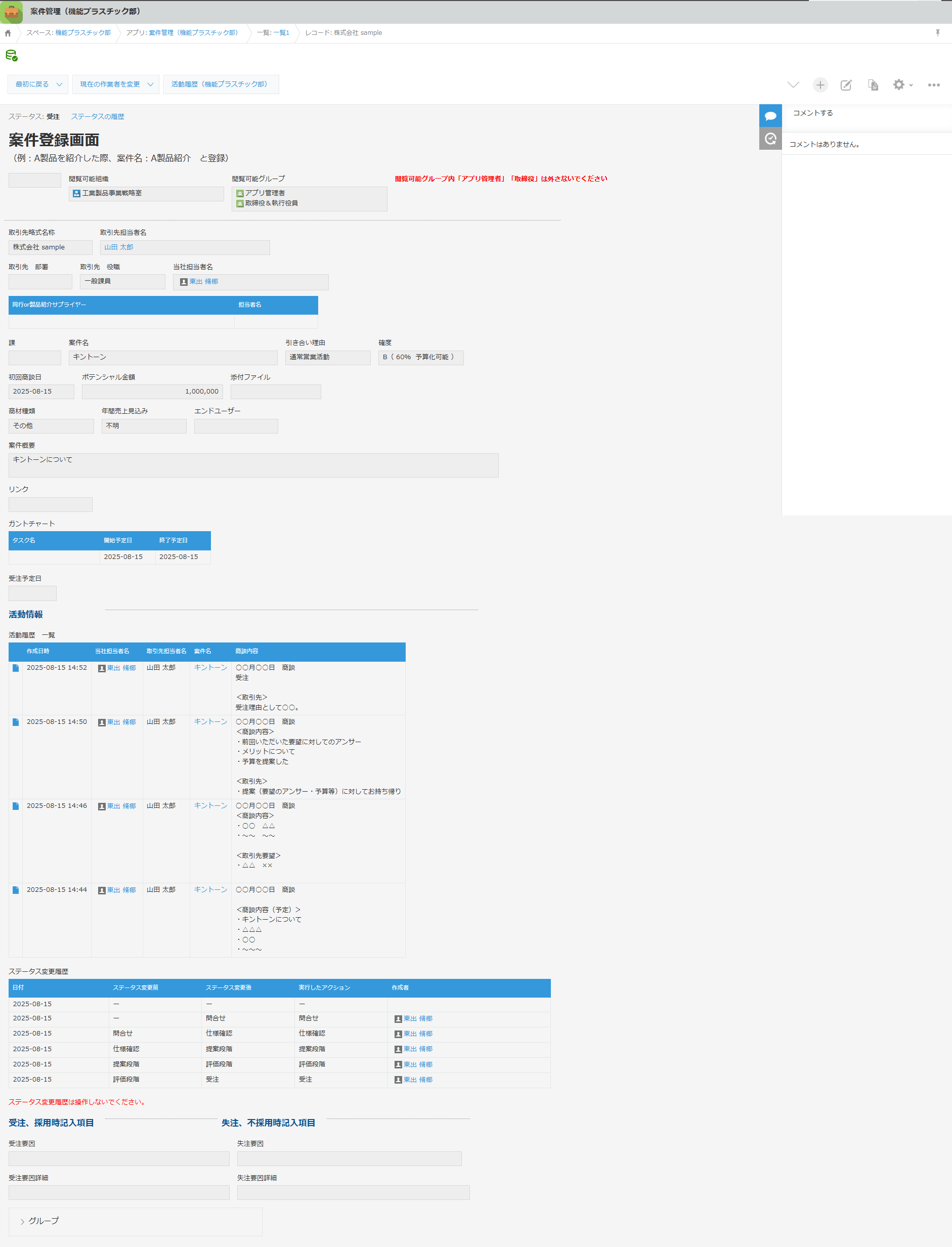 従来のドロップダウンによるステータス管理では遷移状況が不明確であったのに対し、今回導入していただいた「ステータス変更プラグイン」を活用した履歴保存機能によって、例えば見積もり取得から次アクションまでの日数を案件管理アプリ上で把握可能になりました。これにより成約率向上に向けた営業サイクルの分析・改善に活用できています。
