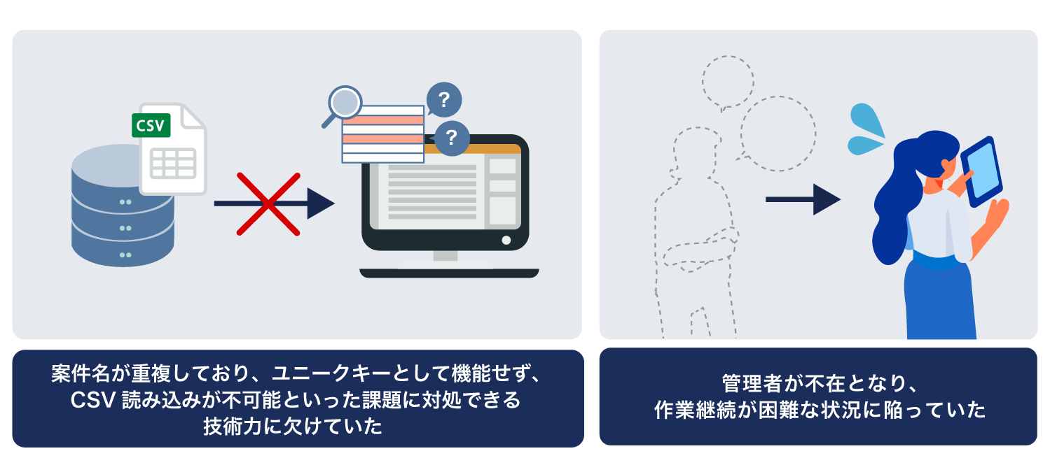 既にSalesforceを運用していた部署の1万件超の案件データをkintoneへ移行する過程で、Salesforce上の案件名に重複があるためユニークキーとして使用できず、CSV読み込みが不可能になるといった事態が多発。さらに担当者の退職によりkintone管理者が不在となり、移行作業は停滞し、限られた時間とリソースの中で「何を、どう進めるべきか」という明確な道筋を見出せない状況でした。