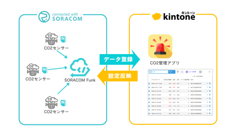 ・飲食店に複数設置されたCO2濃度をkintoneで一元管理し、しきい値を超えた場合は担当者へ通知する。 ・IoTデバイス毎に発行されるIMSIを店舗や会議室名に関連付けて設置場所とデバイスの管理を行う。 ※IMSI(イムジー)はSIMカードごとに発行される固有の番号