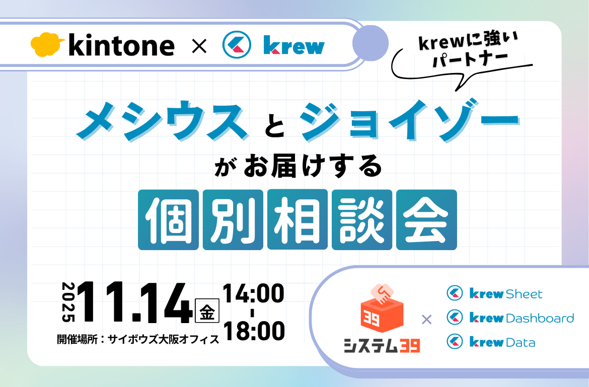 そんなお悩みをお持ちの方に向けて、krewの開発元であるメシウス株式会社の社員と、kintoneを活用したシステム開発やkrewシリーズを始めとした連携サービスの設定・設計に特化した業務改善支援に豊富な実績を持つパートナー企業ジョイゾーが共催する特別相談会を開催します!