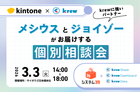 そんなお悩みをお持ちの方に向けて、krewの開発元であるメシウス株式会社の社員と、kintoneを活用したシステム開発やkrewシリーズを始めとした連携サービスの設定・設計に特化した業務改善支援に豊富な実績を持つパートナー企業ジョイゾーが共催する特別相談会を開催します!